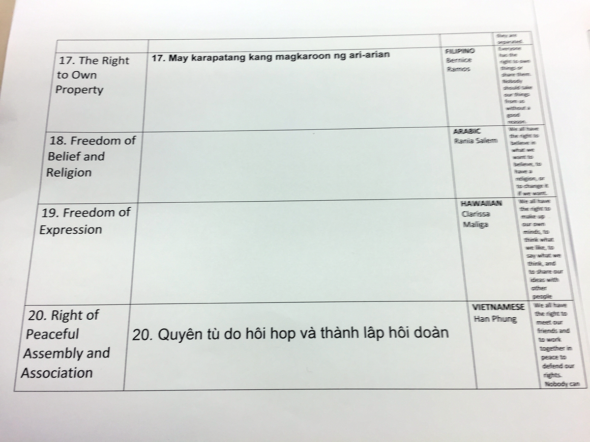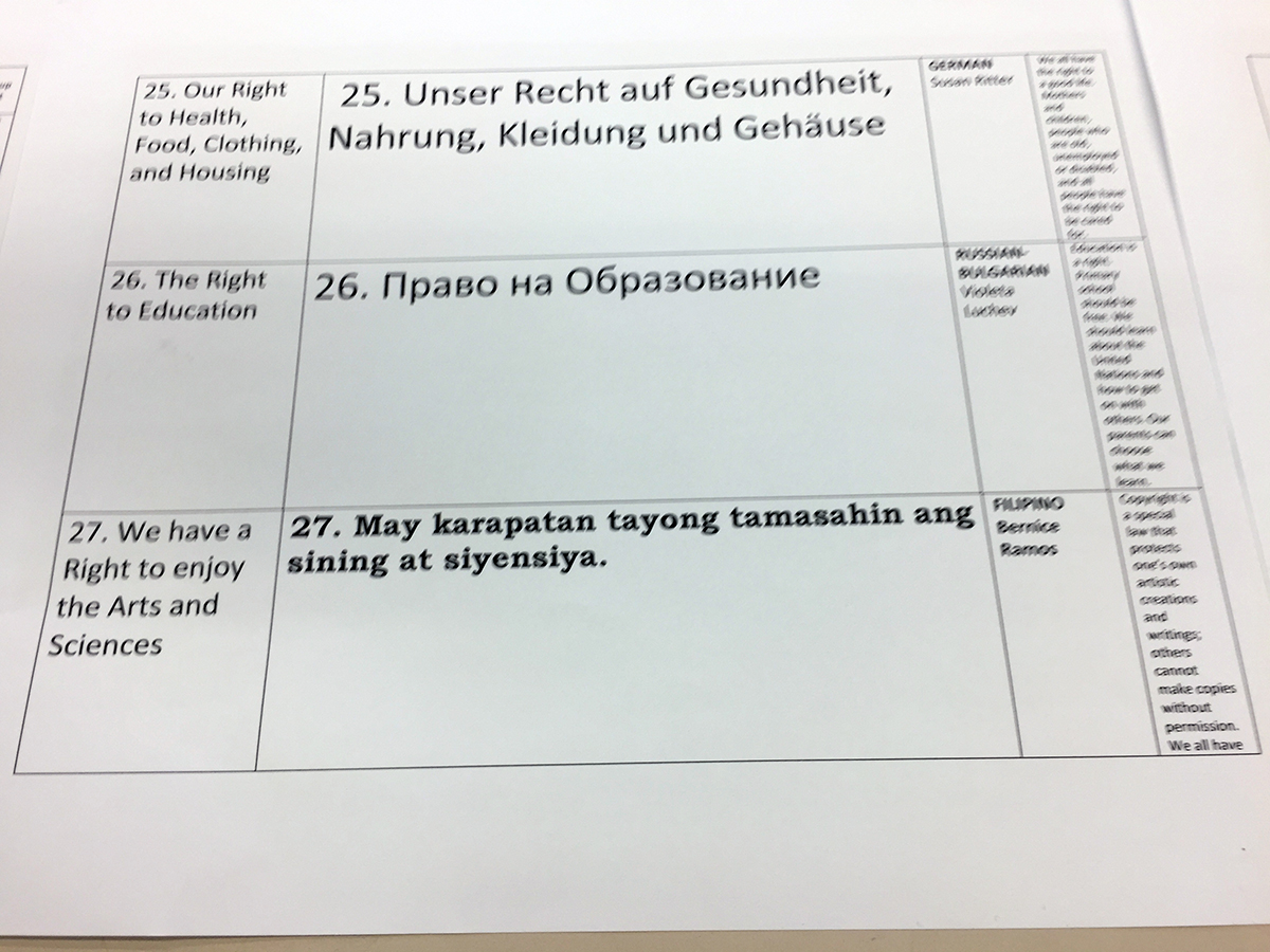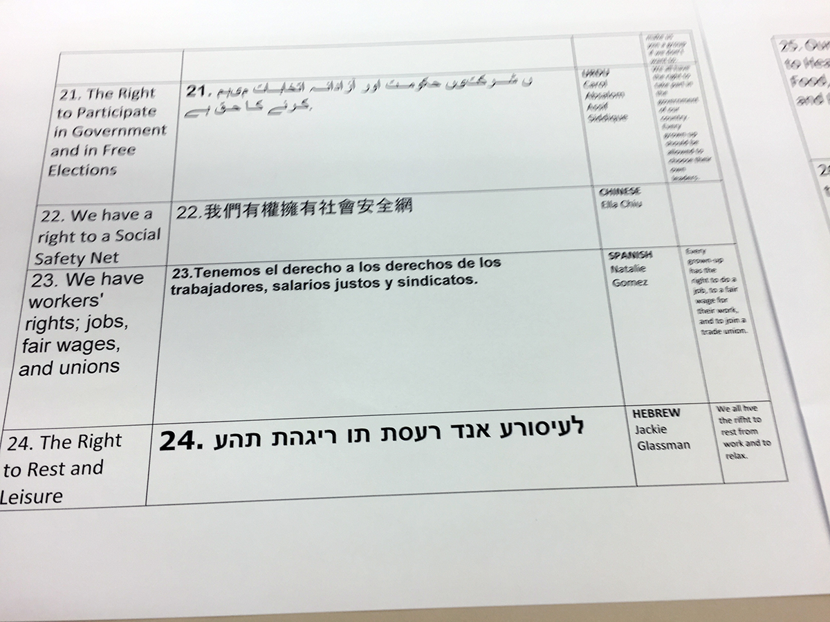 Student government members chose the succinct wording for each article, and teachers and other staff are helping translate the articles into Spanish, Urdu, Russian, Arabic, Hebrew and other languages.