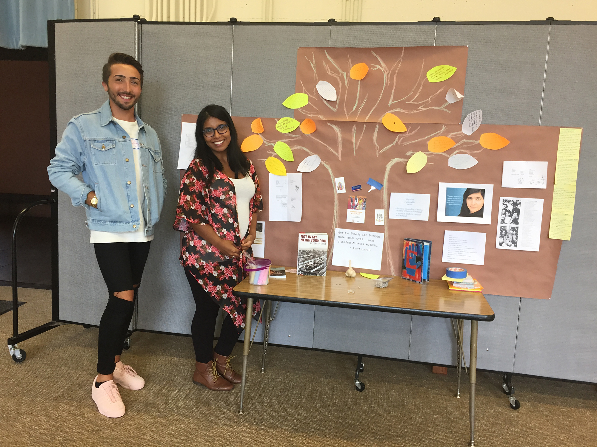 - Anthony Ragone and Natalia Anciso with the human rights tree and its gallery of creative expression. Photo: Pat Steacy, USF